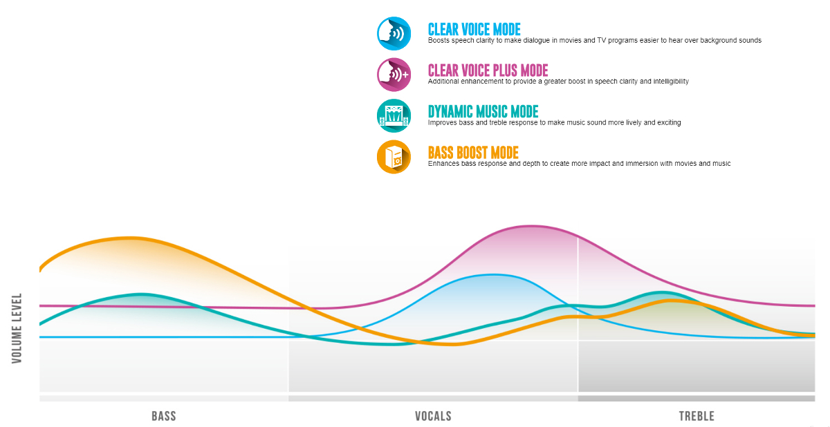 Hear dialogue more clearly with the push of a button – two pre-set "Clear Voice" modes go beyond simply adding volume with improved clarity and speech intelligibility, even at lower volumes, making vocals and dialogue easier to understand in movies, TV shows, and sportscasts.
