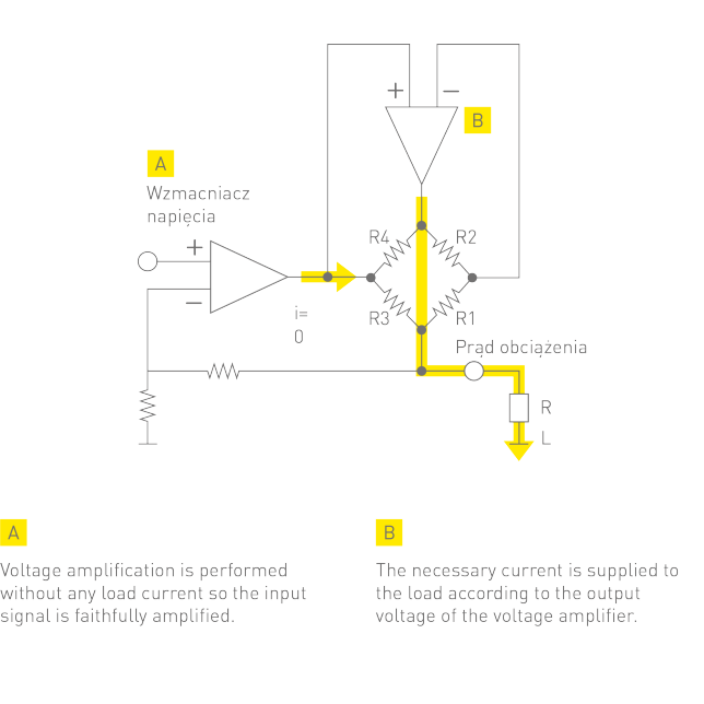 Klasa AB - najpopularniejsza, łączy w sobie rozsądną wydajność prądową z dobrą jakością dźwięku
