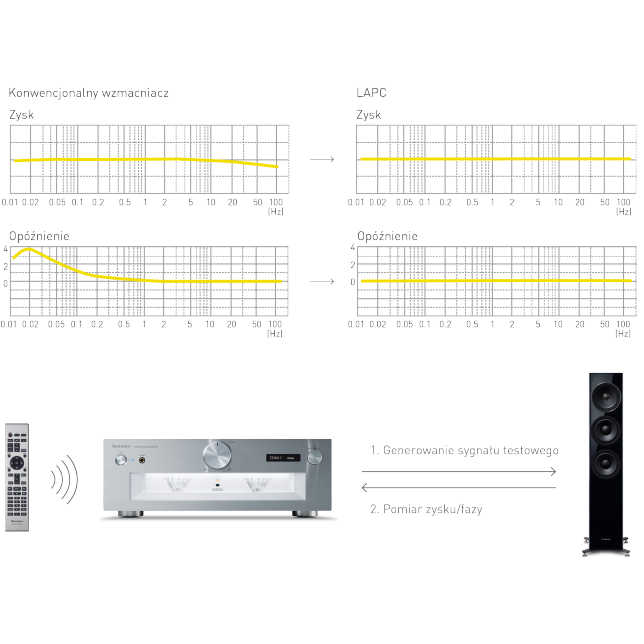 Impedancja kolumn głośnikowych zmienia się przy poszczególnych częstotliwościach, dlatego wzmacniacz powinien napędzać głośniki w sposób niezależny od ich charakterystyki. Niemniej jednak konwencjonalne wzmacniacze cyfrowe są podłączone do kolumn za pośrednictwem filtra dolnoprzepustowego w stopniu wyjściowym, co powoduje, że wpływ charakterystyki impedancji kolumn na te wzmacniacze jest jeszcze większy. Ponadto podczas gdy charakterystykę amplitudową konwencjonalnych wzmacniaczy można było poprawić ze względu na ujemne sprzężenie zwrotne, nie udawało się poprawić charakterystyki fazowej. Dlatego właśnie opracowano algorytm optymalizacyjny, dzięki któremu uzyskuje się idealną odpowiedź impulsową za pomocą cyfrowego przetwarzania sygnału poprzez pomiar charakterystyki fazy — amplitudy częstotliwości wzmacniacza dla podłączonych głośników. Ta nowa technika umożliwia spłaszczenie charakterystyki częstotliwościowej amplitudy i fazy, co wcześniej nie było możliwe, jak również zapewnia wysoką jakość dźwięku o bogatym wyrazie przestrzennym.