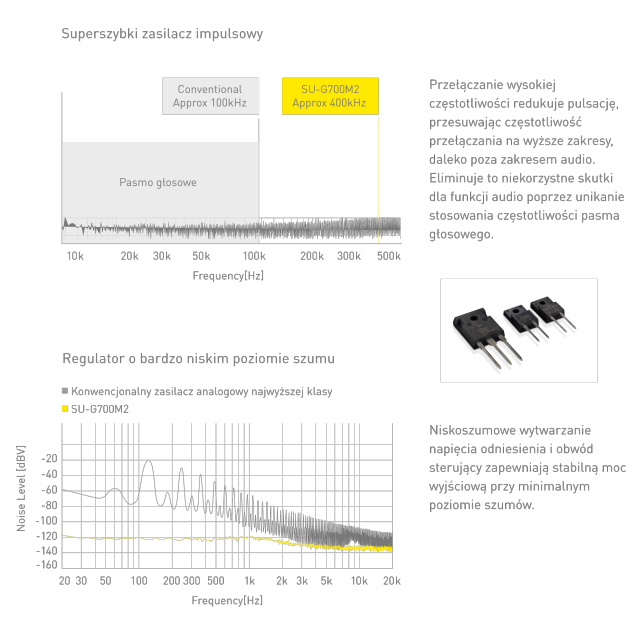 Technologia zasilania wdrożona w modelu SU-R1000 klasy referencyjnej zapewnia wyższą moc głośnika oraz poczucie większej energii. Częstotliwość pracy impulsowej została podwyższona z konwencjonalnego pasma 100 kHz do pasma 400 kHz w celu dostarczania stabilnego napięcia i zasilania oraz ograniczenia negatywnego wpływu modulacji na jakość dźwięku. Urządzenie jest wyposażone w te same przetworniki GaN FET i SiC SBD, co zamontowane w modelu SU-R1000, aby zapewnić maksymalną wydajność szybkiego systemu zasilania impulsowego.